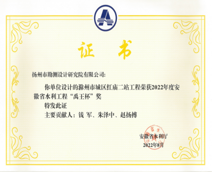 在經(jīng)過申報(bào)單位申報(bào)、主管部門審查推薦的基礎(chǔ)上,經(jīng)資格初審、專家組現(xiàn)場復(fù)查、評審委員會評審、廳網(wǎng)站公示、主管部門批準(zhǔn)等評選程序后,我公司設(shè)計(jì)的“滁州市城區(qū)紅廟一站工程”“滁州市城區(qū)紅廟二站工程”2個項(xiàng)目喜獲“禹王杯”獎項(xiàng)。